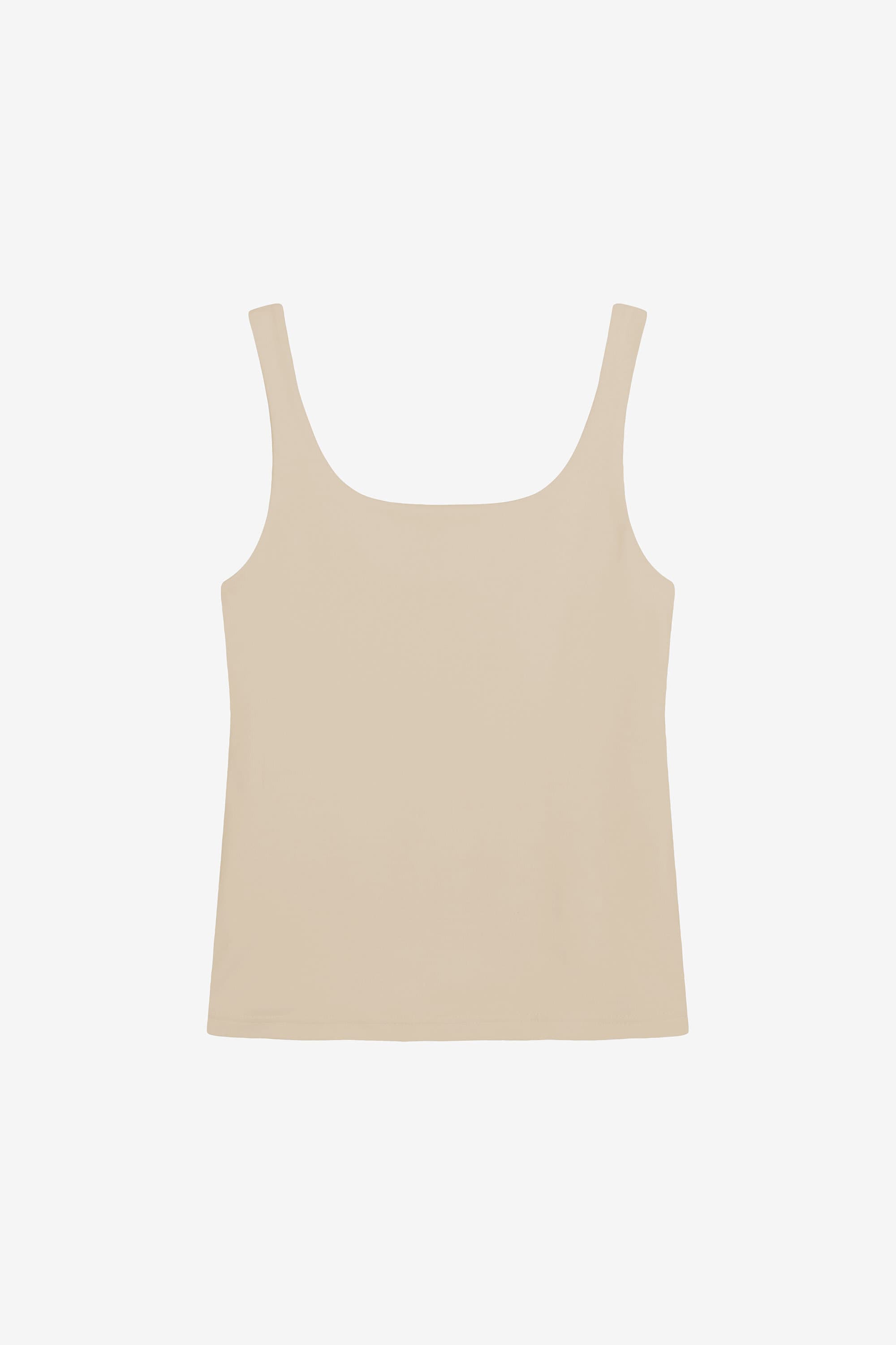 Elegant tank top made from an organic double layered cotton jersey for a luxury feel. Its hidden seams and perfected bands makes it just as suitable for the party as an everyday staple. The unique design is fully covering, has a scooped back and provide a slight shaping feel. We love to style it with almost all items in our wardrobe but especially with a festive skirt or with jeans and a blazer.