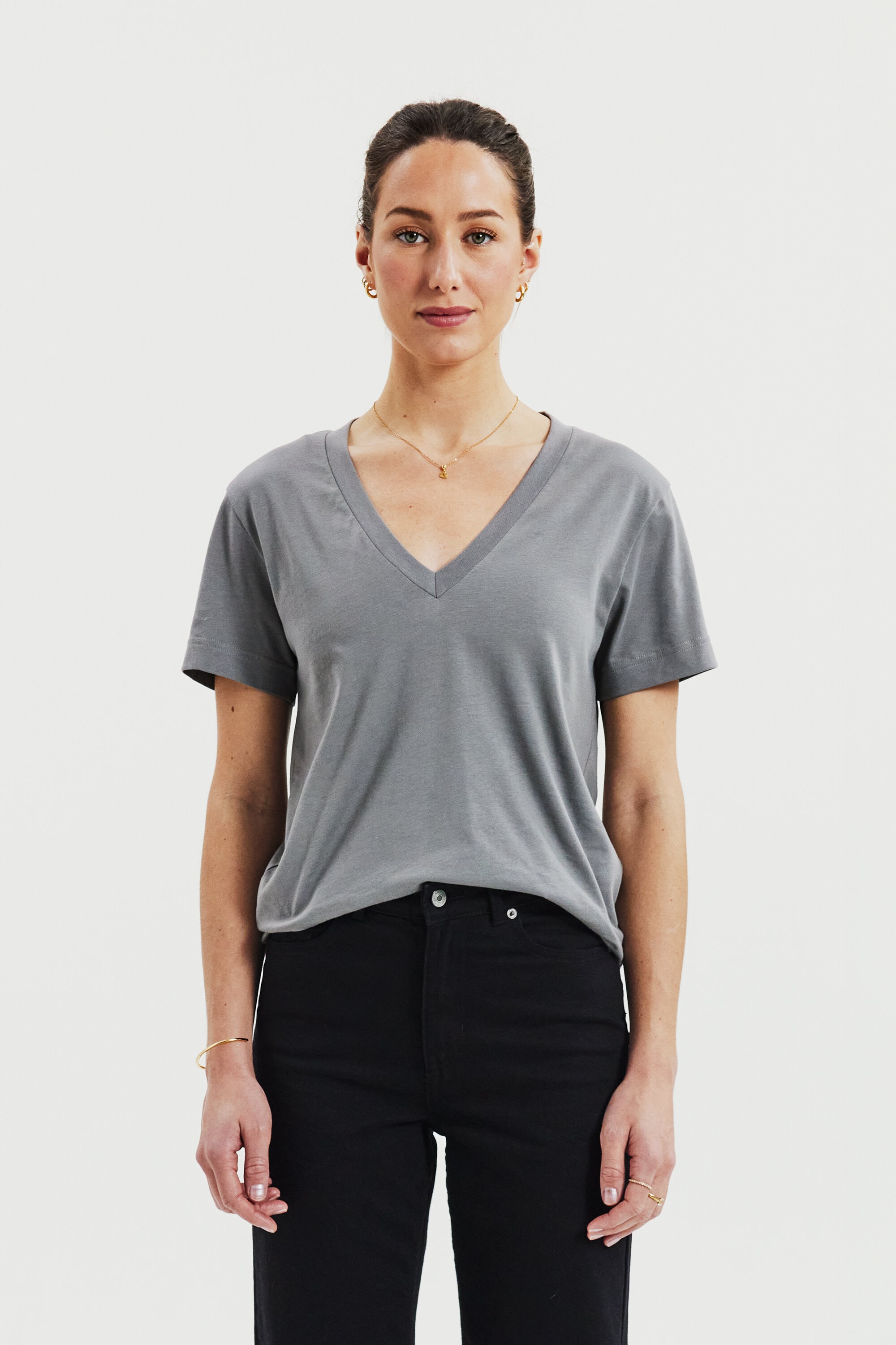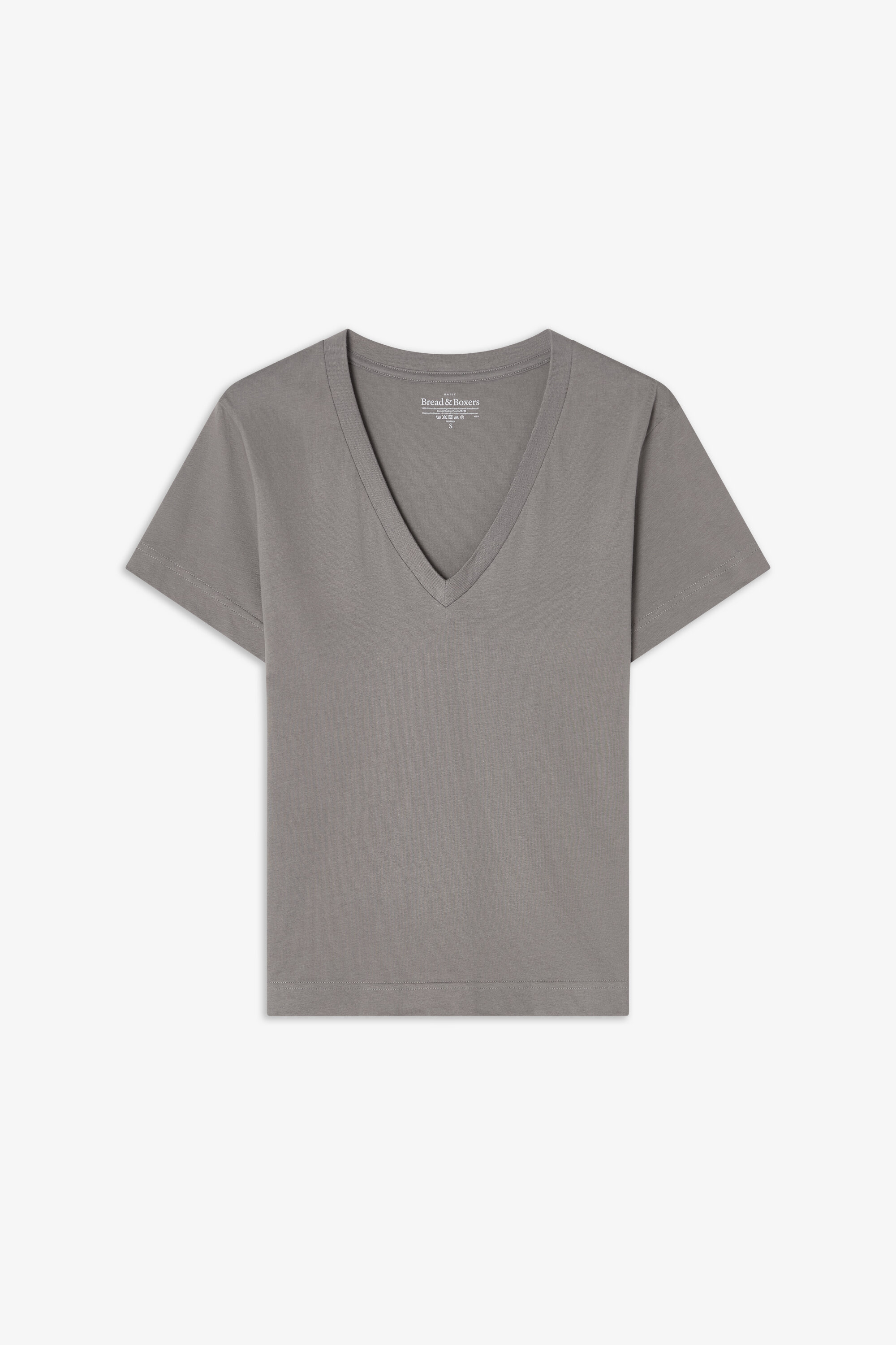 A modern classic, this T-shirt features a boxy cut crafted from dense, soft organic cotton jersey. Designed for a regular fit, it has a generous V-neck and is finished with precise topstitching along the edges—an essential staple for any wardrobe.