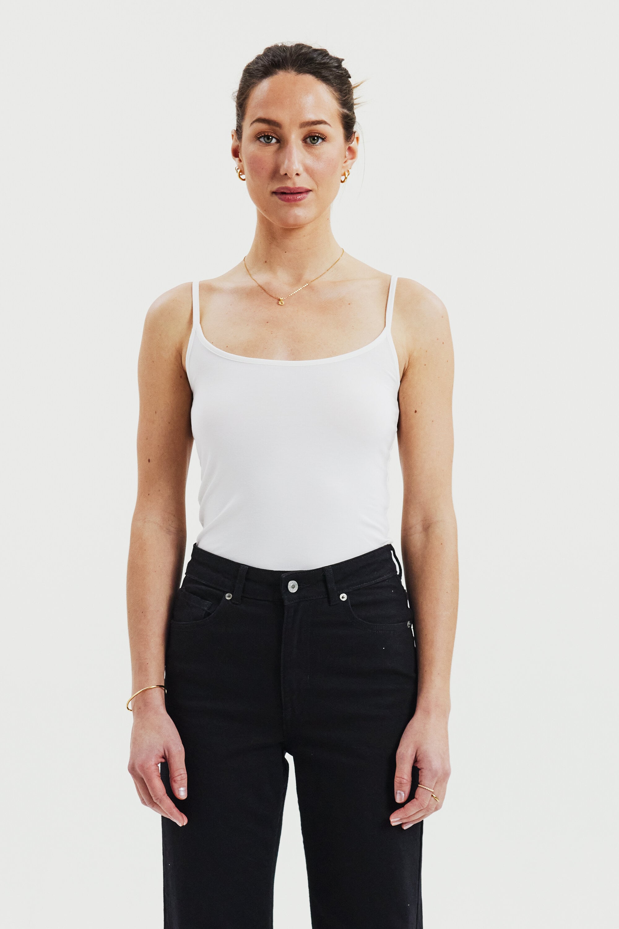 Singlet top with narrow shoulder straps and rounded neckline. Made of soft Lyocell with stretch. Flexible, figure-hugging fit. A perfect tank top to wear as a first layer, or on its own on a hot summer's day