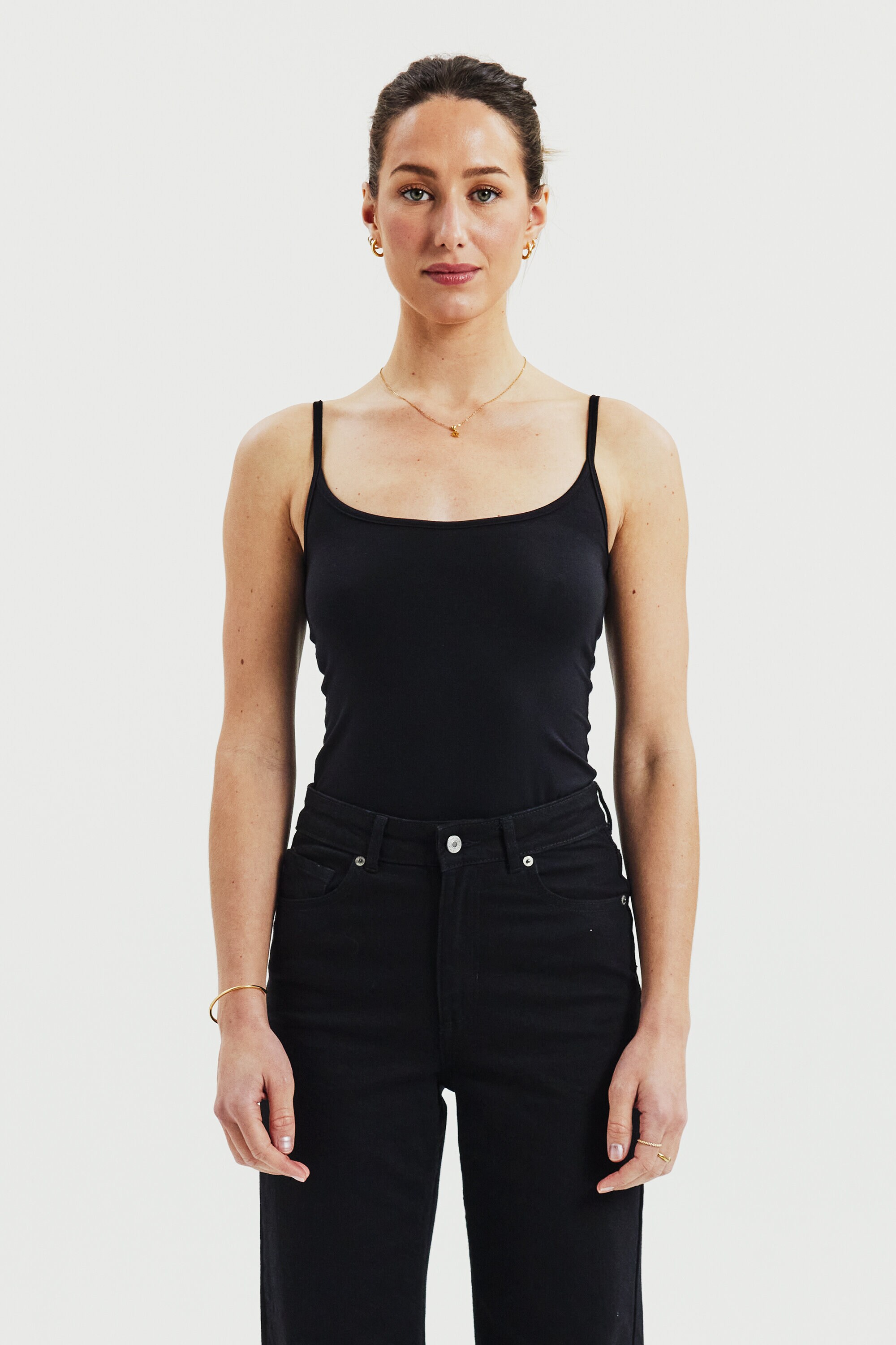 Singlet top with narrow shoulder straps and rounded neckline. Made of soft Lyocell with stretch. Flexible, figure-hugging fit. A perfect tank top to wear as a first layer, or on its own on a hot summer's day.