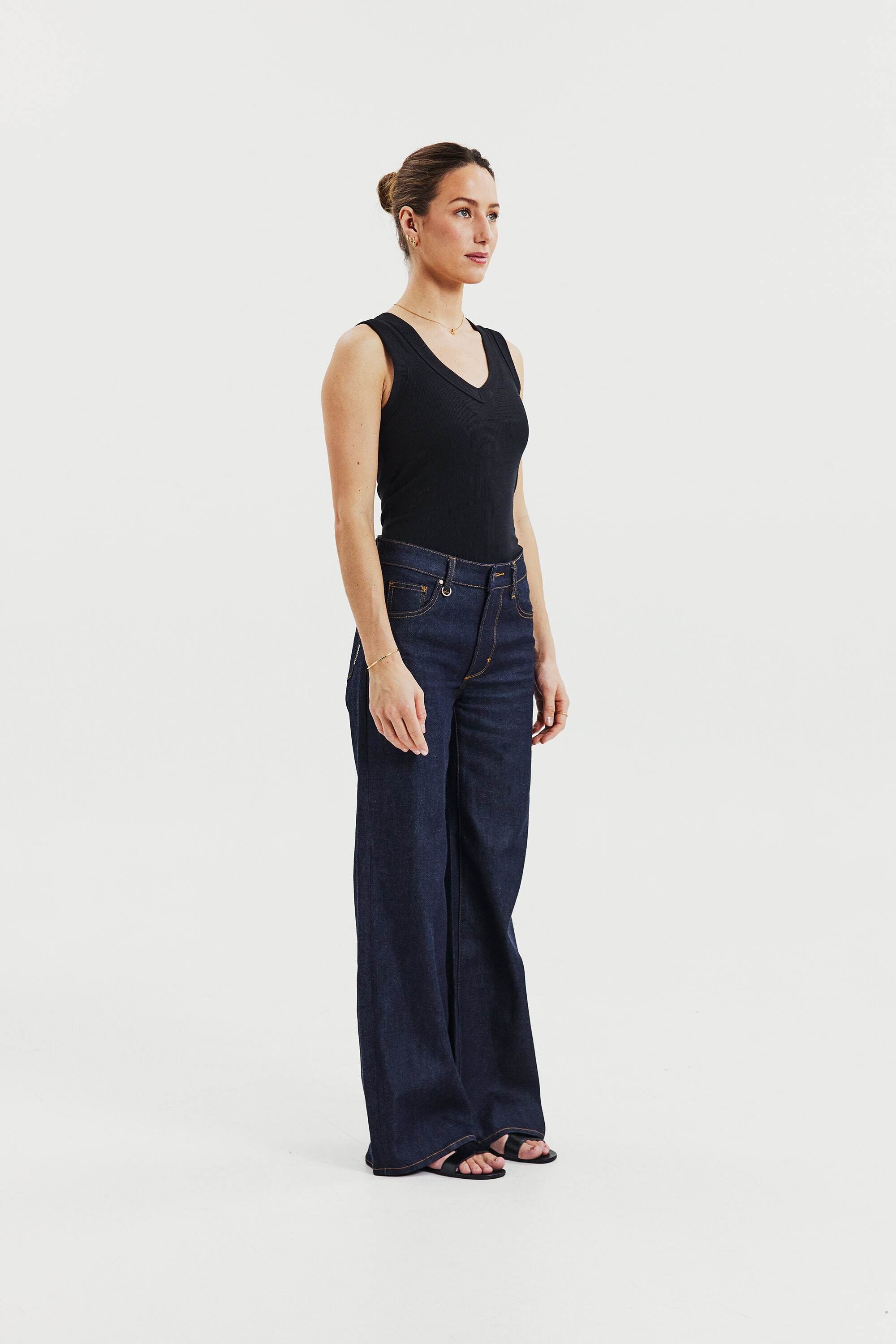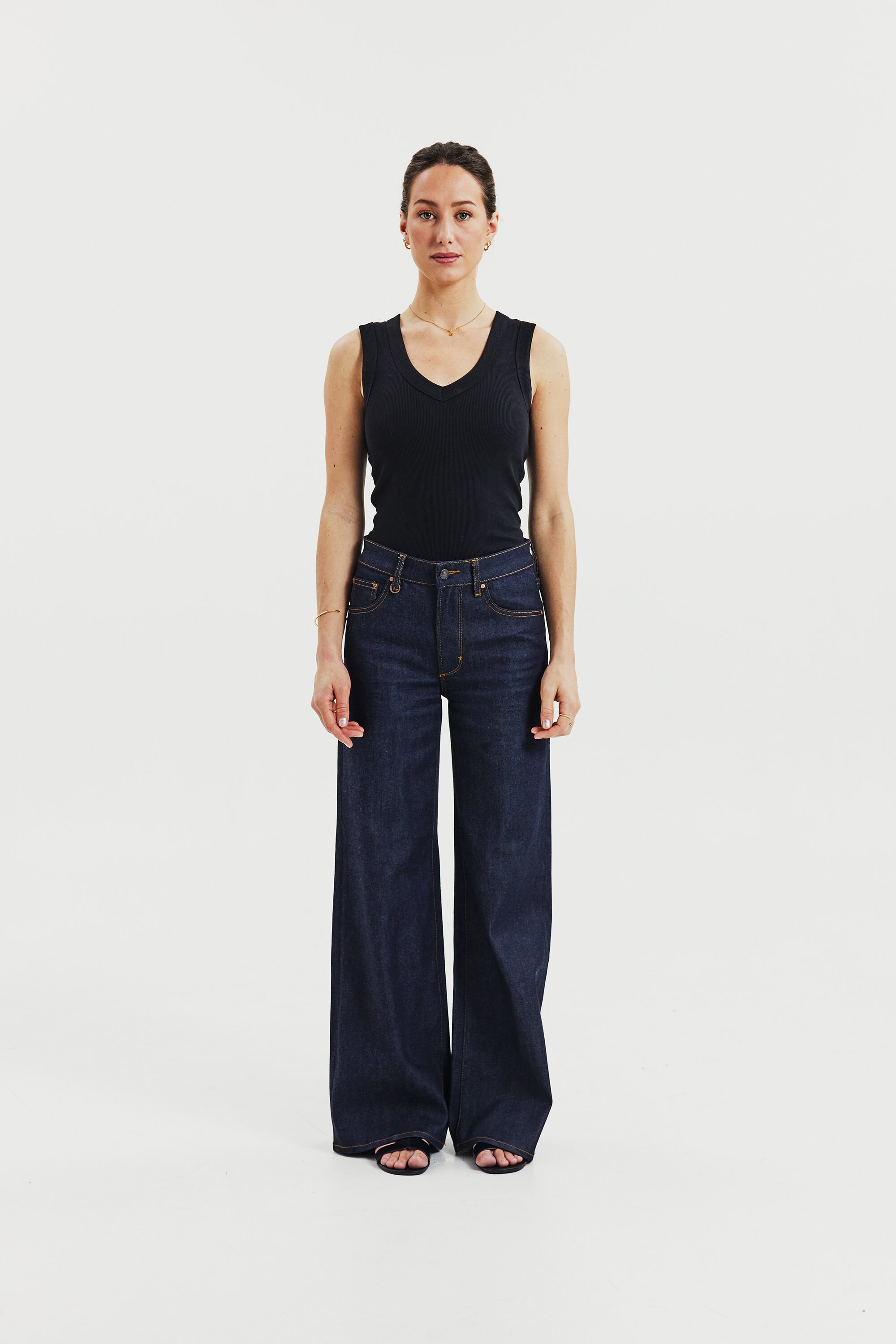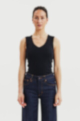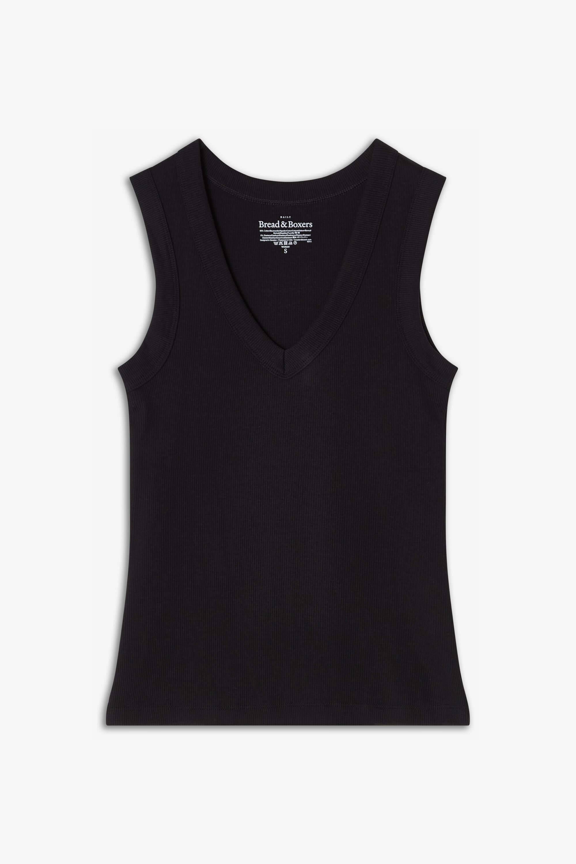 Ribbed tank top for women with a deep V-neckline. Made from a soft ribbed fabric in 95% cotton and 5% elastane for a comfortable, flexible fit. The deep V-neck and wide bindings create a clean, structured look, while the slim silhouette makes this tank top perfect for layering or wearing on its own on warmer days. A simple and timeless cotton tank top designed to become a staple in your everyday wardrobe.